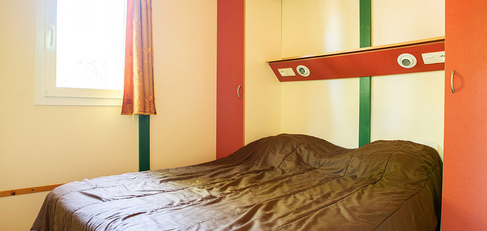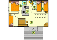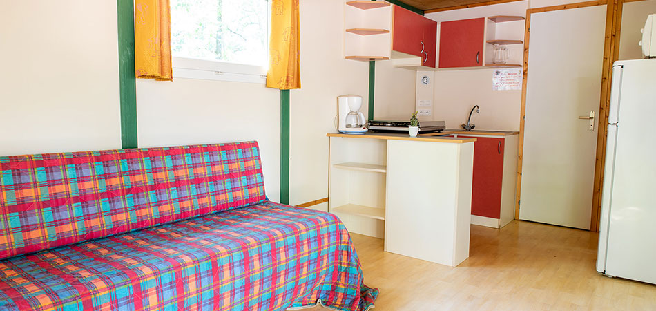 • Séjour : coin cuisine et repas, équipé de 3 feux gaz, micro-ondes, évier inox, réfrigérateur, rangements, table, sièges, ustensiles de cuisine, cafetière électrique… + coin salon avec convertible.