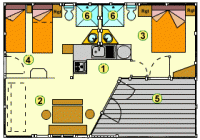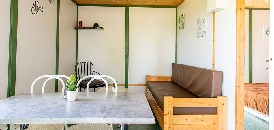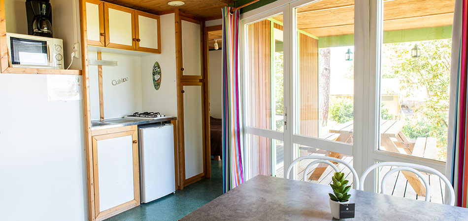 • Séjour : coin cuisine et repas, équipé de 2 plaques électriques, micro-ondes, évier inox, réfrigérateur, rangements, table, sièges, ustensiles de cuisine, cafetière électrique… • Coin salon avec convertible.